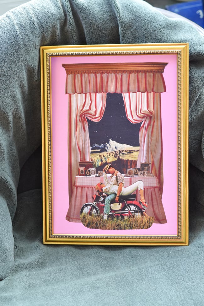 This is a print of the original handcut collage, created from vintage/recycled paper materials. The collage has been professionally printed in A5, A4 and A3 size as Giclée fine art on Hahnemühle German Etching 310gsm paper - a natural white, uncoated acid-free paper. The quality of this paper is outstanding and shows the depth of all the colours in this collage.